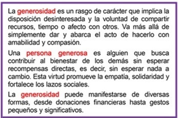 - La generosidad, por lo tanto, no es una idea aleatoria ni un comportamiento fortuito, sino, en su forma madura, una orientación moral básica personal hacia la vida. Además, en un mundo de contrastes morales, la generosidad involucra, no solo el bien moral expresado, sino también muchos vicios rechazados (egoísmo, avaricia, miedo, mezquindad).